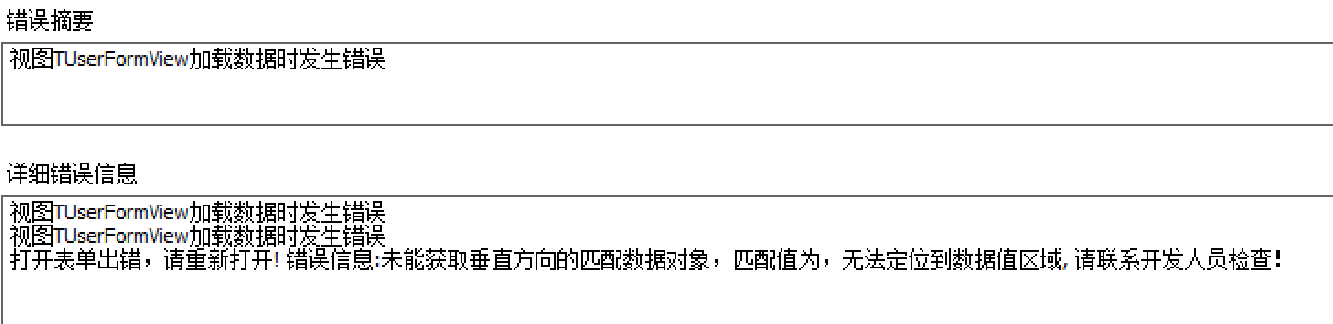 错误打开表单出错,请重新打开!错误信息:未能获取垂直方向的匹配数据对象,匹配值为,无法定位到数据值区域,请联系开发人员检查!