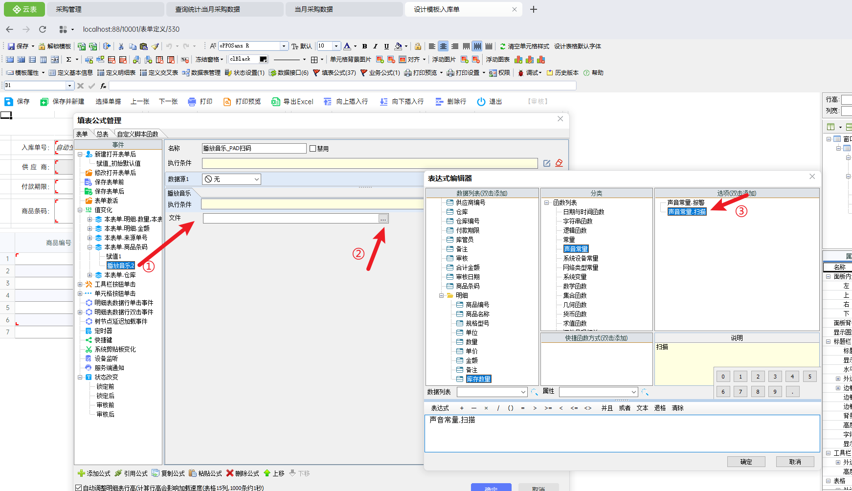 ②为了在单击【播放音乐】按钮后,会执行“播放音乐”操作。我们在“填表公式管理”对话框的“工具栏按钮单击”事件中添加【播放音乐】按钮。