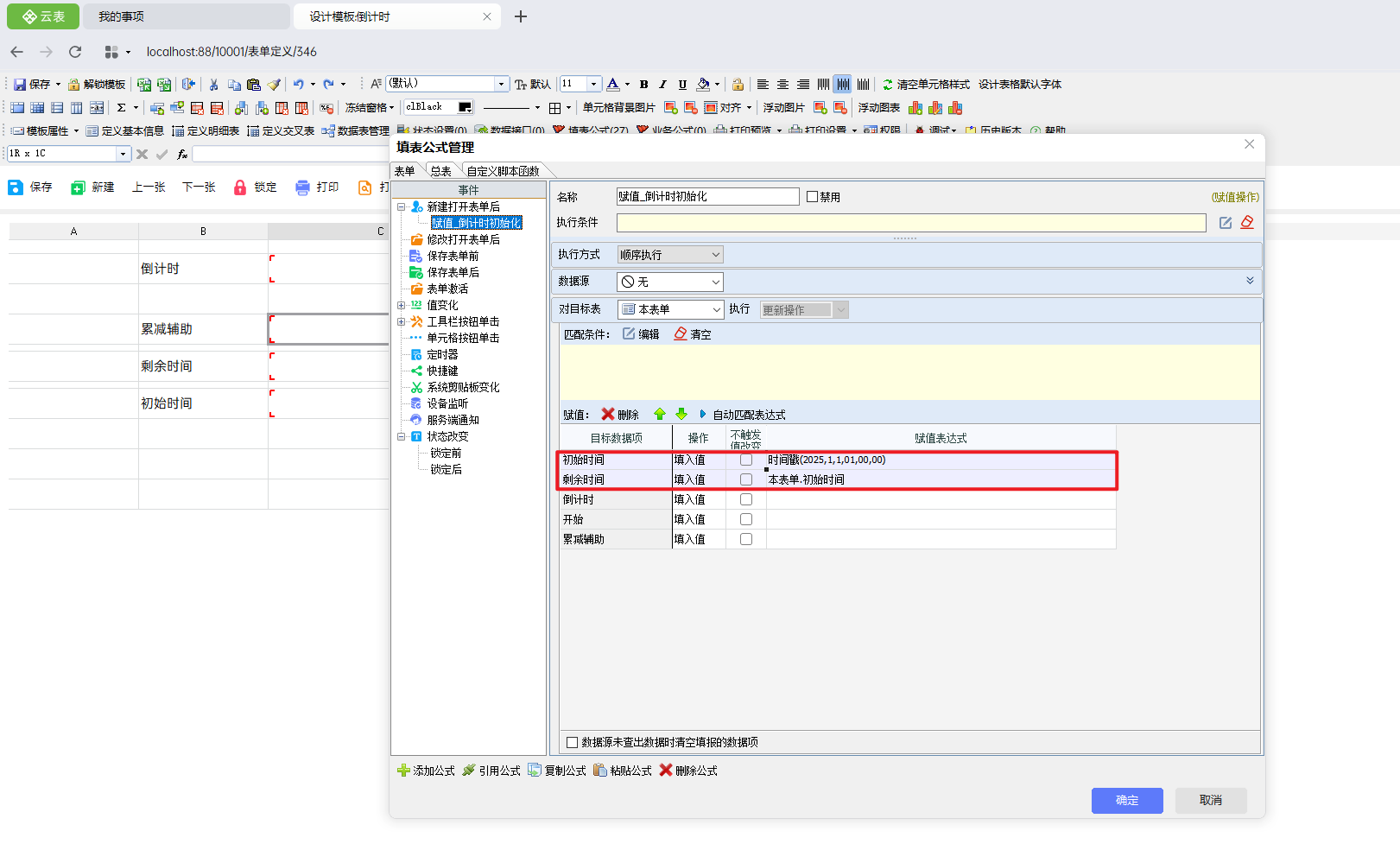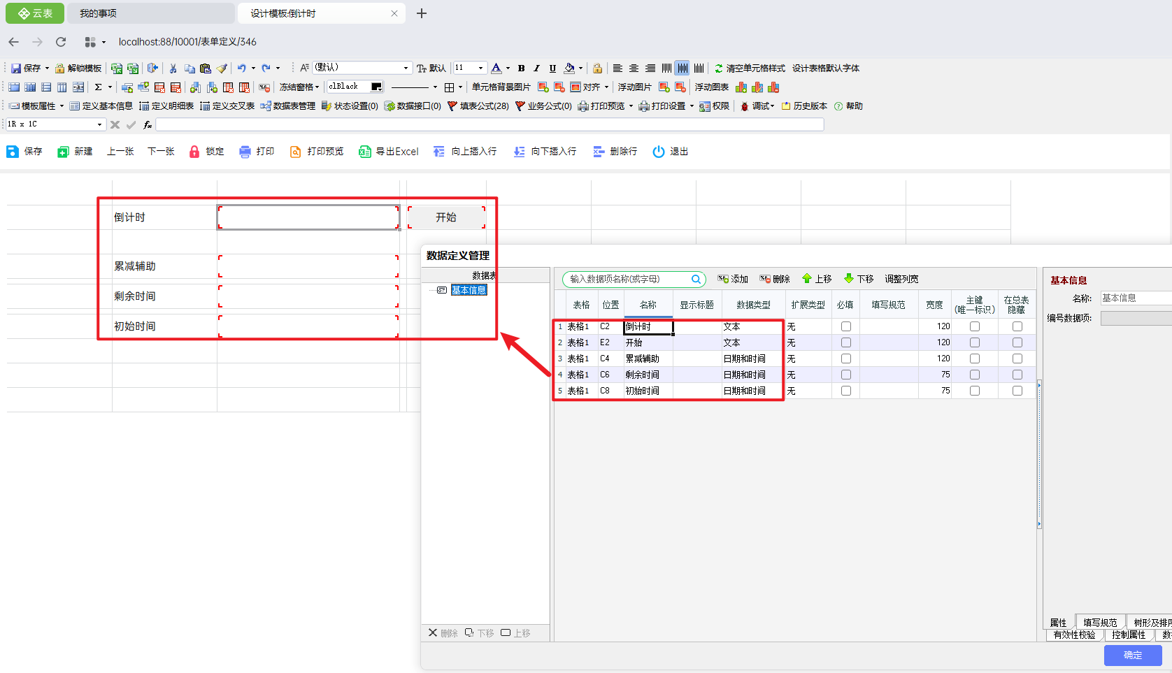 倒计时、开始为文本类型数据项,剩余时间、初始时间、累减辅助为日期和时间类型数据项