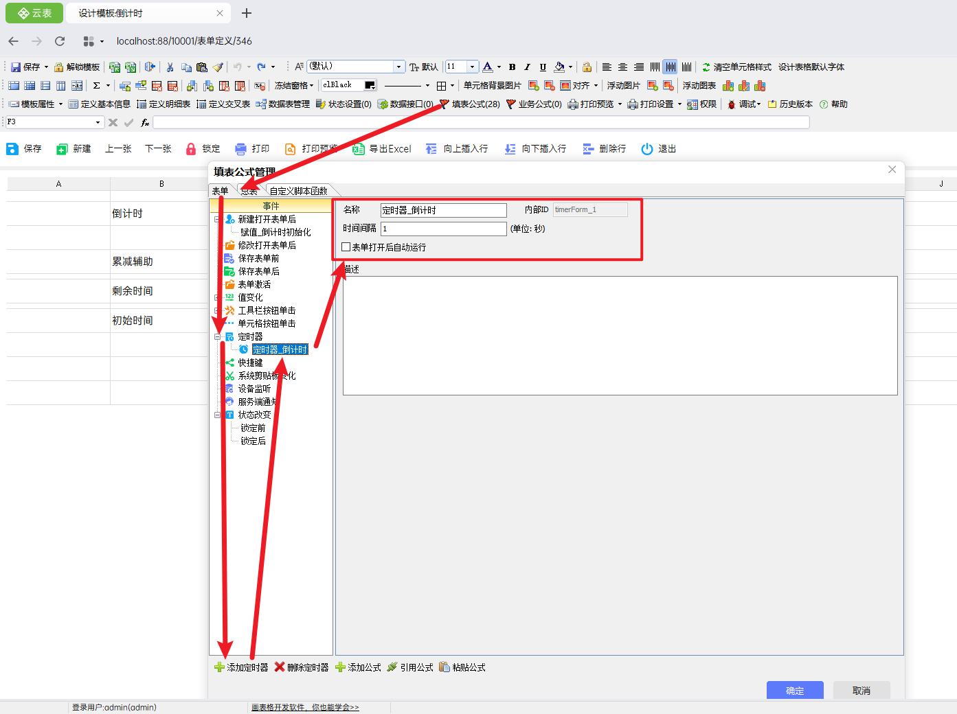 添加定时器,将时间间隔设置为1S(每秒运行一次),取消勾选[表单打开后自动运行]